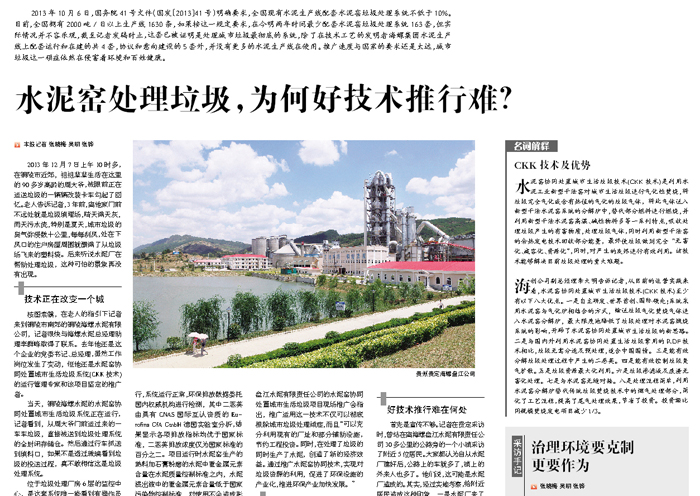 ????2013年5月,由貴州省環(huán)境保護廳和貴州省住房和城鄉建設廳共同起草了《貴州省利用水泥窯協(xié)同處置生活垃圾實(shí)施方案》,並於當年9月10日,以貴州省政府名義下發(fā)了通知,確定將在全省境內建47個(gè)水泥窯協(xié)同處置生活垃圾設施?!斗桨浮繁硎?,2013至2015年,貴州省住房城鄉建設廳每年安排1.5億元用於對水泥窯協(xié)同處置生活垃圾專(zhuān)案建設企業(yè)貸款貼息或補助,其中5000萬(wàn)元用於縣、鎮(鄉)、村垃圾收運系統建設補助;省環(huán)境保護廳每年安排1000萬(wàn)元支持水泥窯協(xié)同處置生活垃圾專(zhuān)案建設;貴州省經(jīng)濟和資訊化委每年安排1000萬(wàn)元用於水泥窯協(xié)同處置生活垃圾專(zhuān)案貸款貼息,鼓勵金融機構加大信貸支持,按照有關(guān)政策予以支持。
