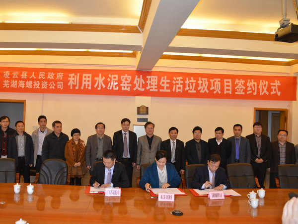 ? ? 2015年3月6日上午,凌云縣人民政府與海螺創(chuàng )業(yè)在凌云縣政府正式簽署了《凌云縣利用水泥窯處理生活垃圾項目合作協(xié)議》,凌云縣縣委書(shū)記方立斯,縣長(cháng)伍奕蓉,常務(wù)副縣長(cháng)游勇滕;海螺創(chuàng )業(yè)總經(jīng)理紀勤應、戰略企劃部常務(wù)副部長(cháng)汪俊賢、戰略企劃部副部長(cháng)章邦志等參加了簽約儀式。