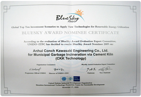 2009年11月17日,該技術(shù)獲得聯(lián)合國 2009年度全球可再生能源領(lǐng)域最具投資價(jià)值的領(lǐng)先技術(shù)“藍天獎”提名獎。